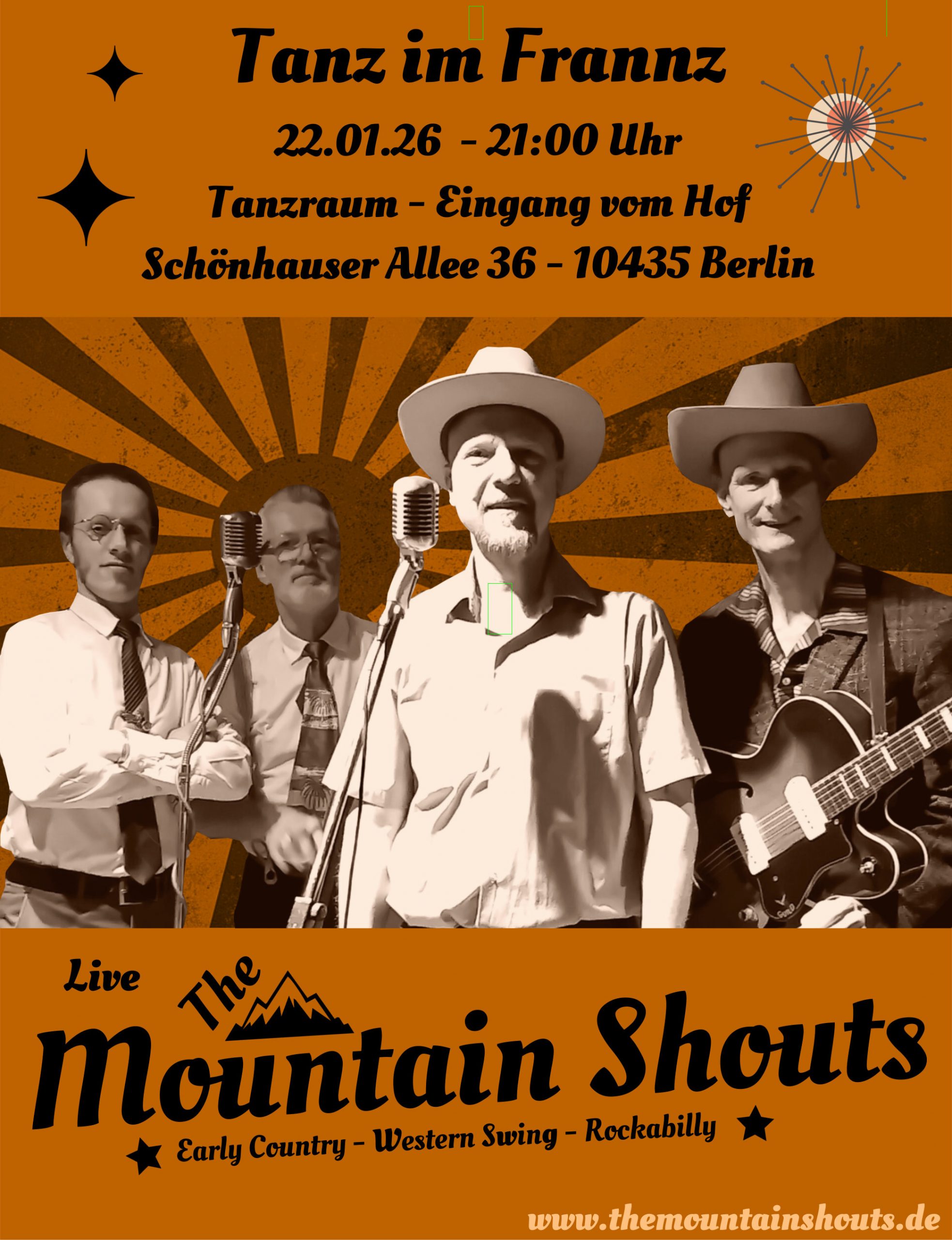 Die Berliner Band „The Mountain Shouts“ spielt Country und Rockabilly, vom Hillbilly-Boogie, über Honky Tonk, bis hin zum Bakersfield-Sound. Das Programm beinhaltet Tunes einflussgebender Musiker, darunter u.a. Ernest Tubb, Buck Owens, Hank Williams, Hal Harris und Curtis Gordon.